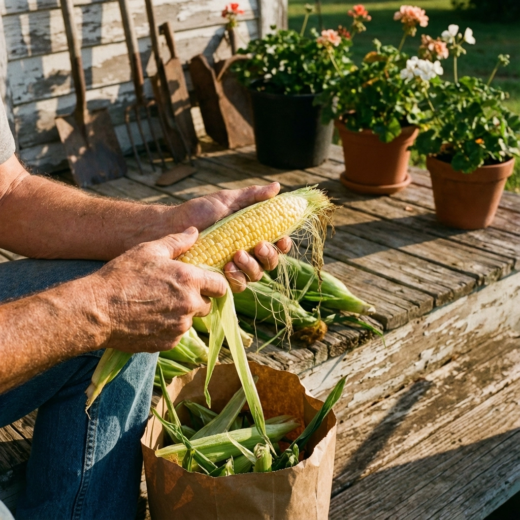 After shucking the corn, we'd always toss the husks over the fence to the neighbor's dairy cows—nothing ever went to waste. The cows would come right up for their leafy treat, and it felt like every harvest helped feed the whole neighborhood, animals included.